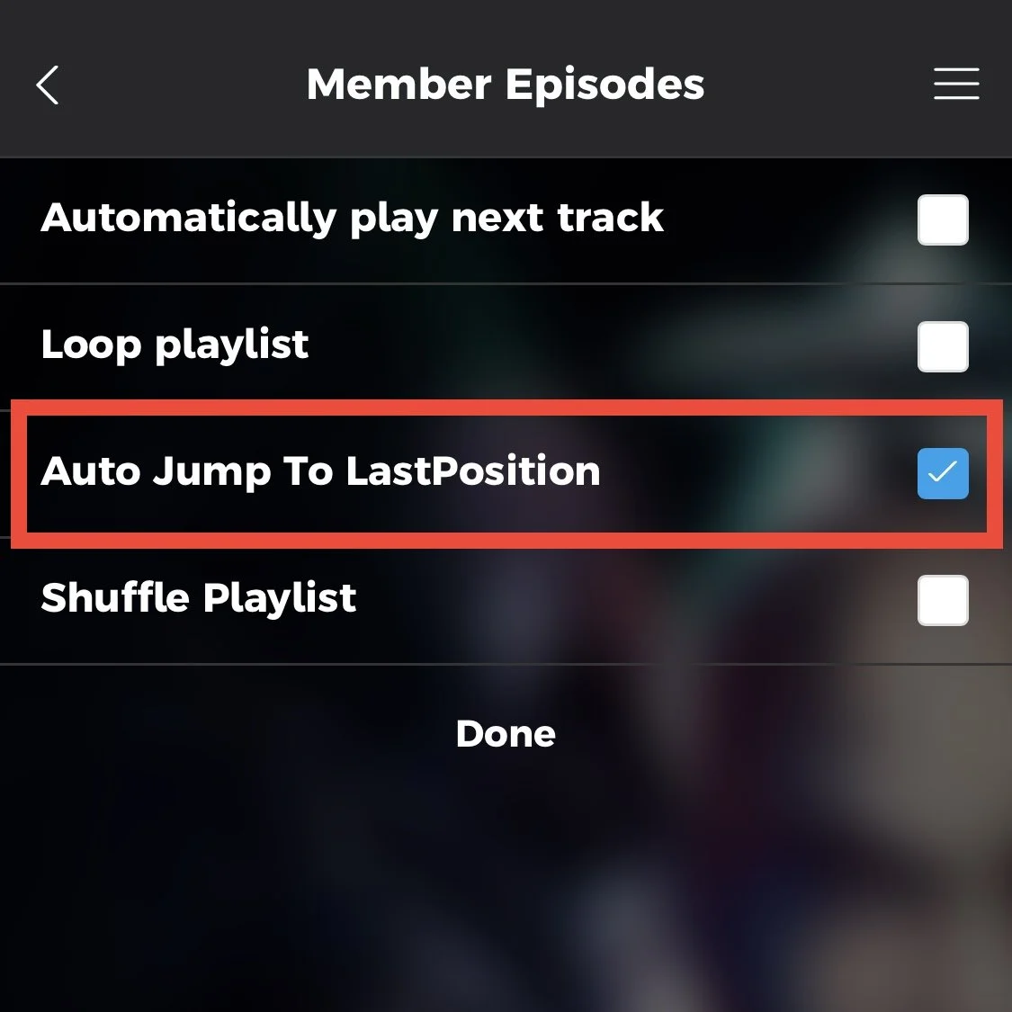 AUTO JUMP TO THE LAST PLAYING POSITION STEP 1:Tap the “gear” button under the play button on your player page. STEP 2:Check the box listed next to “Auto Jump To Last Position” If you need any further help, please email us at contact@theconfessionalspodcast.com, thanks!