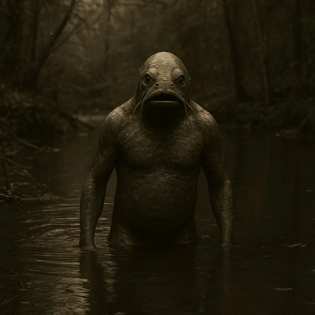 In the secluded hollows of Lawrence County, Kentucky, whispers of a peculiar creature known as the "Catfish Man" have circulated for generations. Described as a humanoid entity with fish-like features, particularly a head resembling that of a catfish—complete with wide mouth and barbels—this cryptid is said to inhabit the waterways near Morgan’s Creek. Local lore suggests that the Catfish Man emerges from the depths during the twilight hours, instilling a sense of dread in those who encounter him. (source)